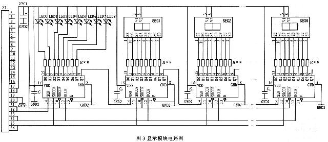 显示驱动采用SN74HC595,是一款串行输入并行输出的移位寄存器,仅需3根I/O端口线即可控制6个数码管和8个发光二极管,极大节省了单片机的资源,电路如图3所示。