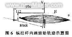 笔者认为,当汽车行驶速度不高时,传统校核法的误差对整车性能的不良影响还不明显,但现代汽车行驶速度越来越高,这项误差不容忽视。采用本文提供的方法,可精确校核转向传动装置与悬架导向机构的运动轨迹,现介绍如下:①建立V-H坐标系,坐标轴含义如前;②以 "两个小圆"+"一段圆弧",组成板簧第一片来代表悬架系统;③当汽车直线行驶或者以某个确定的角度转弯行驶时,转向纵拉杆与前桥相连的球销中心"0"点相对板簧第一片的位置是唯 一确定的。根据它们之间的相对距离,画上"0" 点;④当板簧弧高变化时,纵拉杆与前轴连接的球销中心 "0"点将随弧高而变化;⑤取板簧的弧高值分别为100、70、40、16以及板簧反弓时的弧高-14、-40、-70,分别画出纵拉杆与前轴连接的球销中心 "O"点随弧高变化后的位置点; ⑥画出纵拉杆另一端球销,其坐标值为( 947,112),见图5;⑦纵拉杆长968,以此为半径画圆 弧。该圆弧与球销中心"O"点的轨迹是不重合的,见图6。