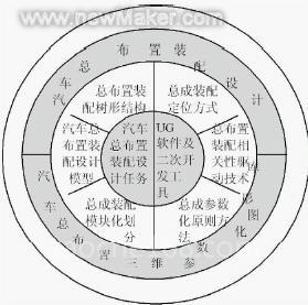 根据上面的论述,结合客车总布置设计任务,以客车总布置参数化模型和三维CAD软件的二次开发为基础,通过总布置装配树形结构的确定、总成的模块化划分、装配定位方式的确定,充分应用装配知识和装配相关性驱动技术,从而构建起基于装配规则和三维CAD技术的客车总布置装配设计的技术应用方案(如图3)。