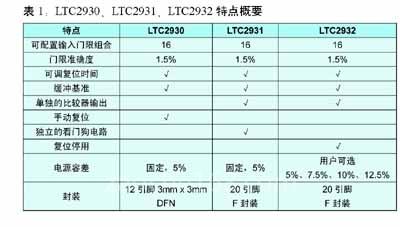 LTC2930、LTC2931和LTC2932能够在?40℃至125℃的温度范围内保持1.5%的门限准确度。凌力尔特公司最新的一组电源监视器 (包含三款器件)是6输入电压监视器,对当今那些需要进行准确电源监视的多电压系统提供了一种理想选择。被监视电源电压的组合由单个引脚来设定。每款器件均提供了16种门限电压组合,从而满足了几乎所有多电压系统的要求。其具有的可编程性免除了针对不同门限电压组合来认证、采购和库存独特器件的需要。