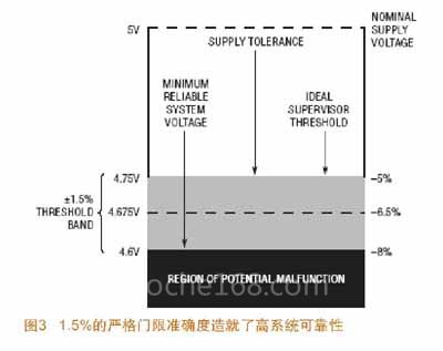 假设一个具 ±5% 电源容差的5V系统,5V电源可以在4.75V至5.25V之间变化。由该电源供电的系统IC必须在此电压范围之内(以及略超出该范围的电压条件下,正如下文说明的) 可靠地运作。如果一个用于该电源的监控器具有完美的准确度,那么它将精确地在4.75V电压条件下产生一个复位信号。然而,如此理想的监控器并不存在。监控器的实际复位门限会在一个规定的范围内波动;在整个温度范围内,LTC2930、LTC2931和LTC2932的复位门限将在其标称门限电压的 ±1.5% 以内变化 (图3)。复位门限范围和电源容差范围两者不应重叠。这可以防止当电源实际上处于其规定容差范围之内时发生错误或麻烦的复位。