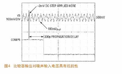 图4示出了针对LTC2931上一个"噪声"输入的COMP5比较器输出响应。在该示例中,一个以500mV为中心的500kHz、100mVP-P正弦波被加至V5输入。即使该信号幅度走低至450mV,COMP5仍将保持高电平。接着,输入的DC电平下降2mV。作为响应,COMP5将被拉至低电平,并保持低电平。如前文所述,只有那些具有足够长的持续时间和足够量级的瞬变才会触发比较器输出被拉至高电平或低电平。