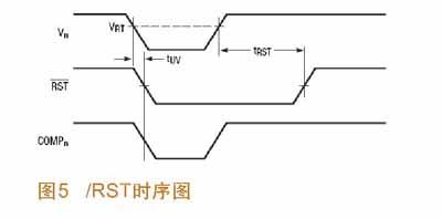 三款监控器均包括一个可调复位超时周期tRST。当所有输入都高于其门限值时,复位定时器即被起动 (图5)。在tRST期间,/RST处于低电平,而且,只要瞬变之间的时间小于复位超时周期,/RST都将保持低电平。换句话说,复位超时可以防止那些频率高于1/tRST的电源瞬变在 /RST 输出上引发不希望的电平变换。在这些电源瞬变期间把 /RST保持于低电平将抑制虚假复位的发生。