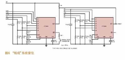 LTC2930、LTC2931和LTC2932上的 /RST 输出是开路漏极,并包含至V2电压的弱上拉电流源。这种开路漏极结构提供了许多优点。例如:这些输出均可以采用一个上拉电阻器在外部上拉至高于V2的电压。这便于使用多个工作于不同I/O电压的器件。此外,还可以把多个开路漏极输出配置成一种"线或"格式 (在该格式中,输出是连接在一起的)。图6示出了两个LTC2930监控器,它们的开路漏极 /RST 输出连接在一起,并利用一个10k上拉电阻器上拉至5V。如果一个 /RST 输出由于某个复位过程而被拉至低电平,则它将吸收电流,并把另一个输出拉至低电平。