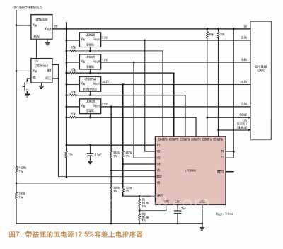 各个比较器输出还提供了电源排序。图7示出了LTC2932在一个五电源上电排序器中的应用。当一个输入达到其门限时,相应的比较器输出将被拉至高电平,并启用下一个DC/DC转换器。