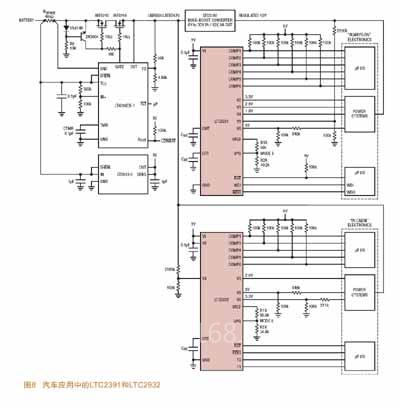 LTC2930、LTC2931和LTC2932监控器容易使用,并具有宽工作温度范围和低电源电流要求,因而使其成为汽车应用的理想选择。图8示出了一种采用LTC2931和LTC2932的汽车应用方框原理图。它是专为凸显和利用这些器件除简单的电压监视以外的诸多特点而设计的。电压监视器由LT3010-5 (一款固定5V微功率线性稳压器) 来供电。电压瞬变保护由LT4356DE-1过压保护稳压器和浪涌限幅器来提供。