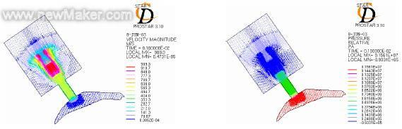 分析 由流场分布图可见,在阀门打开的0.001s 范围内,气缸内部处于等压状态.气流流经火花塞时,压力急剧降低,容器的初始状态是常温常压,压力差值达到8 个大气压左右,气流以超声速流出,而气流流过的截面较小,进入较大的空间从而形成扩散的流动,这种扩散流动的流体微团产生强烈的无规则的脉动,从而形成紊流射流。从截面图可以看出这种射流形成轴对称射流,也就是圆射流。混合气从火花塞孔流出形成一个具有很大速度梯度的区域,射流边界层沿着流动方向不断向两边扩展,外边界向外扩展,带动更多的气体介质进入边界层。内边界向中心扩展,使速度等于初始值的区域逐渐减小,这样沿着流动方向射流边界层越来越宽,造成负压。由于射流边界层不断发展而继续抽吸周围介质的流体质量,火花塞轴心速度连续下降,射流扩展,厚度不断增长,从而形成整个的紊流射流。从温度分布图上可以看出,火花塞处的温度较高,在接近容器口时,温度下降很快,达到302K。沿着气流方向,由于有负压,此处的气体密度相对较低,所以温度也比较低,大约在120K 左右。从压力图上可以看出,混合气以超声速流出,碰到容器壁面时,气流受到急剧压缩而产生激波现象。