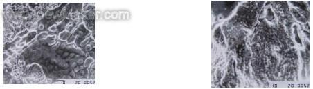 从连杆大头取标准夏比V 形缺口冲击试样,可锻铸铁杆的冲击吸收功AkV平均为6.6J;几批球铁连杆的冲击吸收功AkV为3.3J、4.8J、3.9J、6.0J,可锻铸铁连杆的冲击吸收功较高。可锻铸铁连杆的冲击断口上有白亮区,白亮区SEM 观察主要是铸造凝固的枝晶组织,断口以韧窝为主,并有夹杂物。球铁连杆的冲击断口SEM 分析,断口是韧窝+解理。不同连杆之间断口面的韧窝面积差异同冲击功的差异相一致。