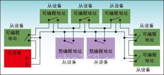 对Slave节点分配地址的方式有两种,一种是系统中所有节点接成菊花链形式,当系统上电后,Master逐一对Slave分配地址,这种称为可编程方式(Programmable)。另一种是预编程方式(PRE Programmed),既从节点器件在接入DSI BUS前预先编好地址。在支持DSI BUS的Slave器件中,有一个作用于电源和信号线的开关,对于预编程的器件,上电时器件的开关是断开的,因为第一个Slave的开关是断开的,所以总线上数据只能到达第一个Slave器件,当Master发出初始化命令初始化第一个地址并闭合开关后,总线数据便能到达第二个Slave器件,再同样对第二个Slave节点初始化。以此类推,直至每一个Slave器件都被设定地址后,总线上Slave节点才开始工作。