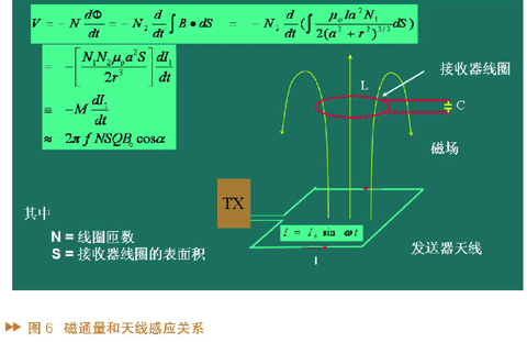图6所示为一个磁通量和天线感应电压关系的公式,这里主要是说明在判断感应电压的时候看到很多的因素:比如线圈的匝数、接触器线圈表面积、频率、接收电线和发送天线的角度都会影响到天线感应的电压。