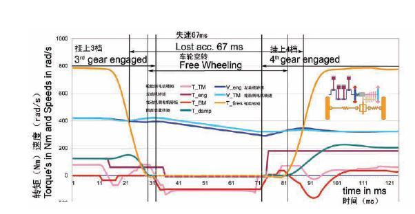 换挡是由EM上的瞬时负扭矩信号和TM上的较长负扭矩信号共同触发,此组合的扭矩信号变化会是阻尼器的变形恢复,然后振荡回去。在t=31ms,它的下降为零,单向离合器处于打开状态,在此期间,出现了两个暂时对立的系统,每一个系统都有电动马达和高带宽。EM的任务之一就是挂上四档之前调节发动机转速到一个合适的值。当四档挂上后,发动机转速的小幅增加会导致EM转得比TM更快,从而使单向离合器锁止,同时阻尼器上的扭矩增加,此后发动机和EM上的扭矩将传递到轮胎。
