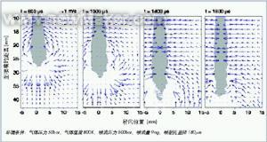 图2所示的4张照片显示了不同速度时刻燃油射束吸入空气的情景(拍摄时间以共轨喷射系统喷射开始时刻为准)。通过图片可以清楚地看出:在一开始时,空气被燃油喷射射束的尖峰向两侧排挤开来,然后形成一个复回流区;在1400μs时,照片中清楚地显示出燃油射束最大的喷射深度;在距燃油喷射尖峰几毫米处,空气被垂直地吸入燃油射束中,燃油射束的直径在距喷嘴大约25mm的位置处仍有所增加。