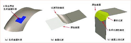 用户能在单个的曲面和一条曲线生成曲面过渡(图3-b),而且用户可以控制过渡的半径值。当不能通过传统的相交或者过渡命令生成过渡的时候,这个过渡生成工具允许用户生成过渡。