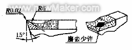 通过试切比较,发现当刀具前角g0=35°~40°时切削效果最好,为增大刀刃刚性,取前角g0=35°。前角g0与断屑槽圆弧半径R、断屑槽槽深h之间的近似关系为