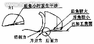 为获得较大卷曲半径的切屑及便于刀具刃磨与检测,选取断屑槽圆弧半径R=6mm,并可计算出断屑槽深度h≈1.1mm。由于实际刃磨刀具时直接检测前角g0较为困难,因此可通过检测h及R来控制g0的大小。刀尖圆弧半径及后角的设计加工铝合金材料要求刀刃锋利,但实际上并不存在理想的锋利刀刃。为获得具有微小半径(R0.01~0.02mm)的圆弧刀刃,可在刀具刃磨后用油石仔细修整刀刃部分。用带有微小圆弧的刀刃进行切削时,刀刃除受切削力作用外,刀刃圆弧部分还受到一个刀刃力作用,其大小与刀刃圆弧半径有关,半径越大,刀刃力也越大。同时,后刀面与已加工表面的相互接触还会产生一个后面力(见图7),其大小除与刀刃圆弧半径有关外,还与刀具后角有关,后角越小,后刀面与已加工表面的相互接触面积越大,产生的后面力就越大,后刀面磨损也越大。此外,当发生切削振动时,小后角容易使后刀面与已加工表面发生干涉。因此,后角应适当选取大一些。设计时,在考虑刀刃刚性的前提下,经试切比较,选取后角a0=15°。