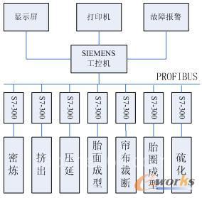 系统原理:在轮胎生产的过程中,轮胎制造工控主机在接收到工艺参数后,将信号传给密炼机、挤出机、压延机、胎圈成型机、帘布裁断机、硫化机等机器的可编程控制器(PLC),各可编程控制器再将信号通过其输出口传出,使机器在系统控制下执行整个密炼、挤出、压延、胎圈成型、帘布裁断、硫化等过程,完成工作。在密炼周期中的每个阶段,主电机的速度由工艺参数设定。在密炼过程中可编程控制器记录一些工艺数据及设备是否完好的情况,并将密炼数据传给PLC作为PLC控制密炼动作及密炼周期结束的依据。同时,系统根据密炼情况自动调整挤出机的速度并自动将压辊和挤出机头间的压力调整到设定值,随着料斗中胶料的增加,挤出机的速度也加快,机头压力增加,压延机也会自动增加速度,使压力保持在设定值,直到挤出机的速度增加到最大,压延机速度最大。当挤出机料斗的料位上升到上限时,挤出机会要求密炼机暂时停机,等料位下降到中位后,密炼机继续工作。在胶部件准备工序中,压延机将轮胎所需骨架材料压入橡胶中,并根据PLC主机预设定参数将橡胶压制成一定形状。在轮胎成型过程中,机器根据设定参数自动完成定长、裁断、同步贴合、整形等工序,这样轮胎就基本成型了。为了加强轮胎的耐磨、抗轧能力,需要进行硫化以增强轮胎的强度。轮胎在进行硫化时的压强和温度的变化直接影响轮胎硫化的质量,这就要求在轮胎进行硫化时,控制系统严格监测和控制硫化的温度和压强使之按照预设值进行,并在温度和压强不足时,采取自动延时硫化的方法进行温度和压强的补偿。