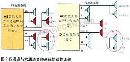 增加两个通道可以解决许多问题。首先,这样可以让功率巨大的低音扬声器单独驱动经过两个新增通道,将声音传送至汽车前座下的扬声器,消除车门回声。还可以实现更高的声音保真度,因为所有扬声器都不必在整个频率范围内运行。四通道与六通道音频结构比较见图2。