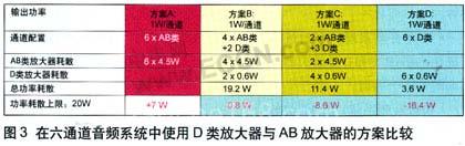 使用六个AB类放大器通道,共计产生27W的功率耗散,这要比音响本体通常最大的耗散还多。但如果混合使用两种放大器就可以达到功率预算的要求,即使是仅使用两个D类放大器(最有可能用于低音扬声器)。图3为在六通道音频系统中仅使用两个D类放大器的方案与其他方案的比较,最后一行显示了20W和特定配置的总功率耗散之间的差值。