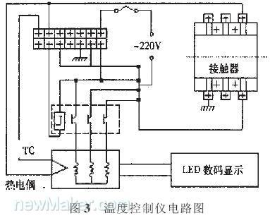控制模具加热温度的温控仪电路图如图4 所示。该温控仪的测温范围是1-1300度,测温精度为1度,并具有过电压、过电流断电保护功能。接触器的最大电流为20A,线圈电压为220V,与动力电连接。显示屏采用LED数码显示。温度传感器为自制的镍铬镍硅热电偶。加热温度可以自由设定。