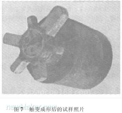 用上述自制的实验装置,对半固态AlMi7Mg合金进行了触变成形实验研究。试样尺寸为直径38mmX45mm,模具预热温度为300度,试样的二次加热温度为588度,保温12min。图7为试样经过触变成形后的照片。