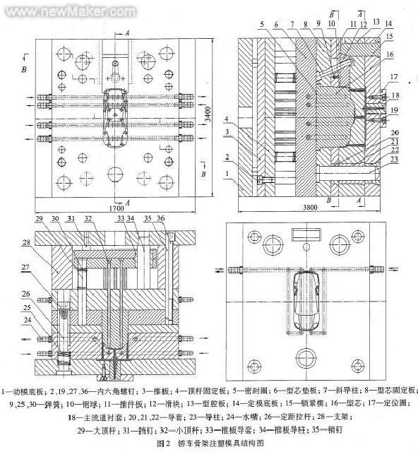 (3)轿车骨架尾部左、右灯孔采用了斜导柱与侧滑块同在动模的分型抽芯机构,可使滑块分型抽芯与合模复位安全;采用顶杆和推件板联合脱模机构,可使脱模时受力均匀,而弹簧可保证顶出系统安全复位。