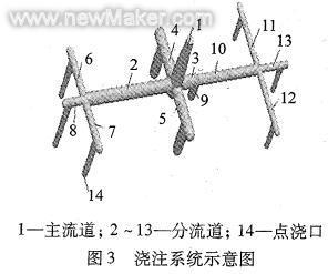 由于轿车骨架的尺寸较大,且尾部又设有需侧抽芯的灯孔,因此该模具采用多点浇口进浇,浇注系统如图3所示。图1中9个点浇口分别设于轿车骨架的前、中、后部,脱模时可自动拉断,在外壁上基本不留痕迹。采用这种小浇口增加了物料的流速,浇口前后两端有较大压力差,便于充模。小浇口处有较大阻力,熔体流过浇口时一部分能量转换为摩擦热,使熔体温度明显升高,可降低表观粘度,增加充模的流动性。另外,小浇口冻结快,可控制并缩短补料时间,有助于提高制品质量,厂缩短成型周期。经CAE优化,浇注系统完全达到预期设计的效果。
