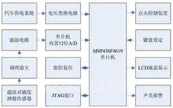系统采用超高灵敏度酒精传感器,超低功耗单片机系统,自动探测酒精浓度的方法,可以防止驾驶人员逃避检测,以判断驾驶员是否是酒后开车,系统总体设计如图1所示。该系统可放置在汽车仪表盘位置,当司机发动汽车时,探测控制仪启动,此时发动机处于被锁状态,汽车无法启动。酒精传感器加热后,探测控制仪对酒精传感器探测的气体信号进行检测。由于酒精含量与酒精传感器检测后产生的电压信号成特定的比例关系,因而可根据电压信号进行酒精含量的判断。检测到的信号经过放大和滤波之后,通过单片机内置的12位ADC转换为数字信号,由单片机对此信号进行处理判断,假设酒精含量没有超标,LCD显示屏幕显示当前酒精浓度,同时正常指示灯亮起,控制继电器不起作用,汽车随之启动;反之,则进行声光报警,控制继电器切断点火装置电源,驾驶人员无法启动汽车,从根本上实现控制酒后驾车。汽车启动后,控制仪随即进入低功耗状态,只有酒精浓度探测电路一直工作,一旦驾驶人员驾驶过程中饮酒,控制仪立即恢复到正常工作状态。