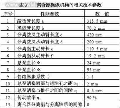 整车及发动机相关参数见表1;离合器的相关参数见表2;离合器操纵机构的相关技术参数见表3。