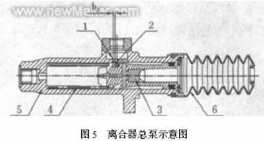 图4为该汽车离合器操纵机构的示意图。离合器的操纵机构采用液压传动,气压助力式,踏板采用吊挂式踏板。各个总成采用国产件,对离合器分泵进行了重新匹配设计,满足了使用要求和互换性。