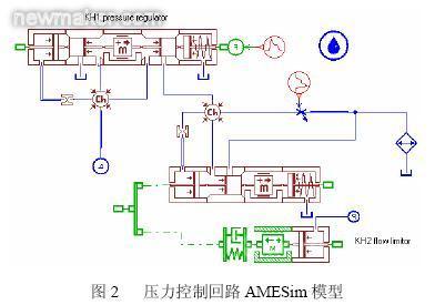 压力控制回路是利用压力控制阀来控制或者调节整个液压系统或一部分的油液压力,以满足液压元件所需的压力,防止系统过载。溢流阀采用了并联弹簧结构,目的是为了实现分级调压。模型建立的难点在于处理弹簧的并联及弹簧的空行程以实现弹簧座的复位和控制油压的调节。通过柱塞来控制压力,反向作用压力作用在阀盖和柱塞之间的环形面积上。外弹簧刚度1.224 N/mm,初始压力调准为227.74N,内弹簧刚度1.211 N/mm,初始压力调准为81.69 N。