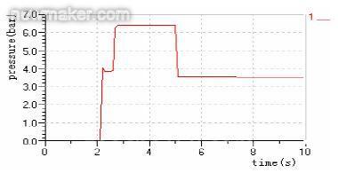 假定在5s时刻满足闭锁条件给出闭锁信号时,关闭电磁铁ET1,油道6中压力下降,换向阀P32在复位弹簧作用下换向处于初始位置,油路4直接和操纵油路1相连,溢流阀和调压阀共同作用使变矩器的入口压力调整为0.35MPa,满足其闭锁工况要求。