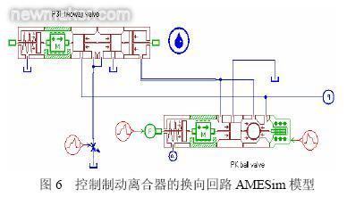 方向控制回路是控制执行元件运动方向的回路。通常情况下采用二位或三位换向阀可使执行元件换向。两位三通换向阀作为控制牵引—制动型液力变矩器闭锁离合器和制动离合器的主要部件,设计要求其响应速度要迅速准确,而且在充油过程中绝大多数时间内要处于最大开度。在AMESim的Sketch中搭建控制制动离合器的电磁开关球阀和两位三通的模型如图6所示,操纵压力1.6 MPa,两位三通阀弹簧刚度1.301 N/mm,弹簧初始压力为123.39 N,可控球阀PK1回位弹簧刚度1.283 N/mm,弹簧初始压力不小于47 N,背压0.1 MPa。