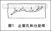 沿裂纹方向、在离裂纹端点外约3~5mm处钻一个限制孔(见图1)以防裂纹继续扩展,钻孔直径为5~10mm。