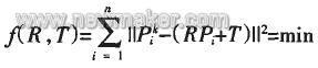 ICP算法中第三步采用最优化解析方法计算Pk和Qk之间的变换对两模型中的对应点列进行匹配,通过迭代得到数据点集的最优匹配参数,在每次迭代中,对空间两模型中的对应点进行匹配的过程只考虑Pk和Qk之间存在的刚体变换关系情况,即Qk=RPk+T,其中尺为3×3旋转矩阵,F为3×l平移向量,最终使目标函数方程(5)最小。