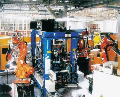 龙门式凸焊冲压机的结构是一种全新的设计,采用了伺服控制技术,并经过了一年半的实际生产验证,非常适合于大批量的生产。在生产线中,冲压机的周围安装了3台上下料机器人。紧靠龙门立柱,两边共有四个独立的、可保持冲压力恒定的电动机驱动单元,利用传感器对凸焊焊接力进行调节控制。值得注意的是该凸焊冲压机的性能数据:最大凸焊焊接力40kN/每驱动单元,凸焊焊接电流最大130kA,设备总功率1200kVA。