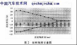 同样参考《汽车工程手册》承载式轿车车身扭转刚度试验准则,在车身后塔形支撑处约束6向自由度,在前部塔形支撑处当量加载5810N/m的扭矩,分别进行左扭和右扭的仿真分析。在上述弯曲刚度测量点示意图位置点测量出位移,并换算成相对转角,如图2所示: