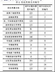 通过对燃料电池车改制件分析,确定以所有改制件(包括中纵梁)的板件厚度和中纵梁的形状为优化变量。由于中纵梁有挂载锂电池等限制,只能以中纵梁高度为优化变量,而且高度变化还受整车最小离地间隙的限制。从燃料电池车强度分析来看都有较大剩余,并且必要时可以对特定部件改用高强度钢替换材料,所以车身优化时强度不作为优化约束条件。而车身模态(绕X轴扭转和绕Y轴弯曲)与车身扭转和弯曲刚度直接相关,所以本文以燃料电池车改制件为优化部件,以弯曲和扭转刚度为约束条件。从燃料电池车刚度来看,弯曲和扭转刚度都较原型车有较大提高,弯曲和扭转刚度降低小于5%时仍然能满足车身刚度要求。所以本文希望在弯曲和扭转刚度降低小于5%的基础上,达到使改制件重量有较大降低(>20%)的目标,优化变量及编号见表1。