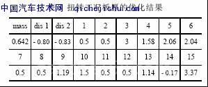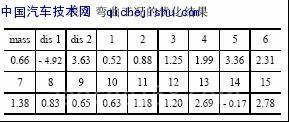 在两种工况下分别对15个优化变量做基于弯曲刚度的正交试验,即做出15因素2水平正交表,分别同量的改变优化变量的值,得出弯曲和扭转响应值(左右纵梁测量点位移)的变化,从而求得优化变量对响应值的灵敏度。