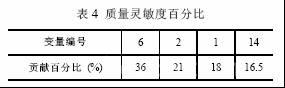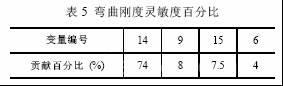 综合两种工况变量灵敏度分析结果可得到质量灵敏度百分比、弯曲刚度灵敏度百分比、扭转刚度灵敏度百分比,见表4~表6。