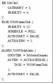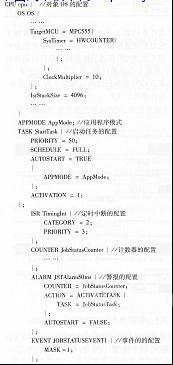 对于不同的OIL 实现,为对象定义的属性会有所不同,设计时尽量避免使用OSEK/VDX标准中没有规定的属性,以提高OIL文件的重用性。ECU软件框架设计时使用的部分OIL代码如下。