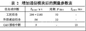 4.1 无外部通信模块的情形测量的参数值如表1所示。非周期任务的最小到达时间TMINT可以作为非周期任务分析时的周期时间使用,此处TMINT是发动机转速为3 000 r /min时的值。MPC555的系统时钟频率为40MHz,在CME- 555的外部FLASH中运行程序。