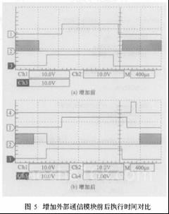 工况任务的第2 个执行块的执行时间增加了150μs,它是新增通信模块中50ms周期发送信息的代码。图5是增加外部通信模块前后执行时间的对比,其中通道1是油量任务,通道2为空闲任务(空白部分表示CPU在执行代码) ,通道3为工况任务,通道4为外部通信任务。