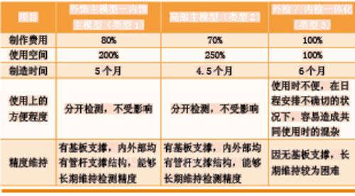 三种类型的功能主模型检具各有各的特点,主要区别如表。从表中可以看出:内外饰一体主模型具有占地小的特点。而局部主模型在制造周期和费用方面占有较大的优势,制造费用较内外饰一体主模型节省30%以上,制造周期短,也是局部主模型的一大特点。