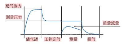 图1是一种质量流量法泄漏检测的工作示意图,其检漏过程为:调压器调制到规定压力;关闭旁路阀和传感器阀,打开充气阀和储气罐阀,向储气罐充气;当压力监控传感器显示已达到额定充气压力后,关闭充气阀,打开旁路阀和开启阀,从而向工件充气;在被测件内腔经充气和一段时间的稳定后,关闭旁路阀,打开传感器阀,进入测量阶段;若被测工件存在泄漏,则在测量阶段由于工件内腔相对储气罐阀的压力差就会导致气体从罐向工件的流动;最后,通过流经传感器的气流,利用质量流量法计算出该被测件的泄漏率。图2则形象地反映了上述测量系统的检漏过程。
