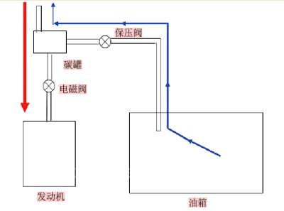 在燃油系统中(见图7),碳罐起到了净化(燃)油蒸气、减少环境污染的作用。如蓝色箭头线所示,当油蒸气从油箱通过管道和保压(单向)阀进入碳罐时,罐中活性碳的吸附作用使其得到净化,期间单向阀开启,电磁阀关闭,这个过程称为碳罐的吸附过程。而当发动机正常工作时,如红色箭头线所示,管路中的电磁阀打开,单向阀关闭,发动机进气歧管内的负压,导致外部气流从碳罐大气口进入罐内,产生冲刷作用,将碳罐中的汽油分子扫到进气歧管中燃烧,恢复碳罐内活性碳的活力,这个过程称碳罐的脱附过程。按国家标准进行脱附试验,其目的就是为了确认轿车燃油系统工作的有效性。