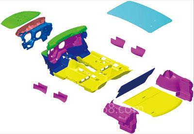 乘客舱的隔音垫按位置分成三部分,分别是前围板区域隔音垫、地板区域隔音垫和车顶区域隔音垫。