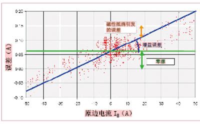 可以看到,图3集中了所有被测值,误差主要是由正向偏差(蓝线上部)和负向偏差引起(蓝线下部分)的,这两部分会相互补偿而抵消。对于感应误差有相似的情况,这样磁性误差与感应误差就变得可以忽略不计了。另一方面,电气误差(水平绿线表示)是个恒量,这种误差不能忽视。线性误差没有在图形中显现出来,主要因为被测传感器的线性度较好(如果线性度较差,那么图中的蓝线将不是一条直线,而是曲线或波浪线)。这样源边的正负电流不被仔细考虑的话,其产生的误差也就不能被抵消。