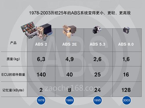 进入20世纪80年代以后,由于进口美国的汽车装备有ABS,美国汽车制造厂对美国汽车市场上的ABS显示出新的兴趣。随着微电子技术的飞速发展和人们对汽车行车安全的强烈要求,ABS装置在世界汽车行业进一步得到广泛应用。1987年美国大约3%的汽车装备有非常可靠的ABS。在随后的时间里,研发者集中于简化系统。在1989年,博世的工程师成功地将一个混合的控制单元直接附在了液压模块上。这样他们就无需连接控制单元和液压模块的线束,也无需接插件,所以显著地减轻了ABS 2E的整体重量。