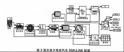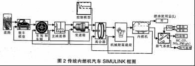 在ADVISOR2002中,传统内燃机汽车和混合动力电动汽车的SIMULINK框图分别见图2、图3。