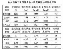 混合动力城市客车在不同路况下的燃油经济性分析选定四种循环行驶工况,依次为B USRTE、UDDS、1015以及5PEAK。四种路况数据见表4。